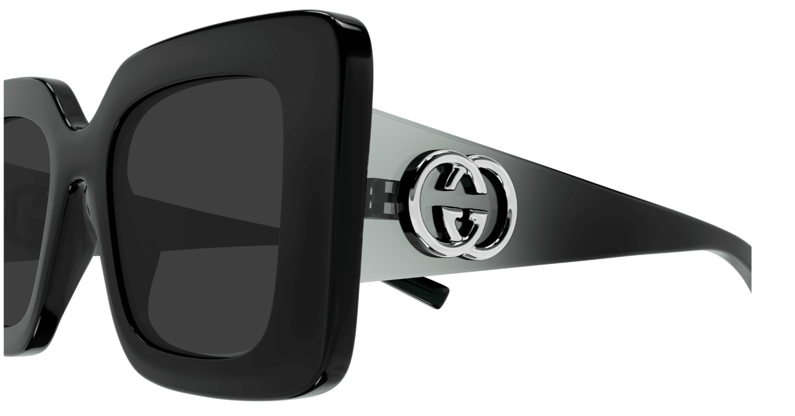 I Gucci GG2025S-001 si distinguono per un design deciso e contemporaneo, perfettamente visibile nella foto: una montatura oversize squadrata in nero lucido, con volumi importanti che esaltano lo stile bold tipico della maison.
