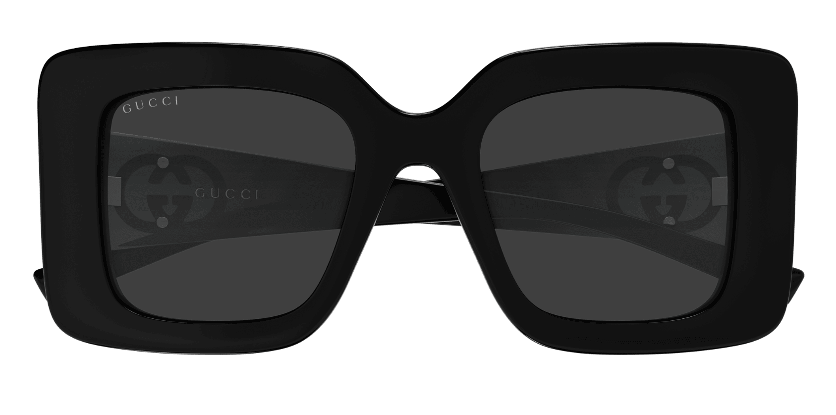 Il frontale ampio e geometrico dona carattere e presenza, mentre le aste si arricchiscono di un importante dettaglio: il logo GG metallico oversize, che diventa protagonista e firma immediatamente il look.