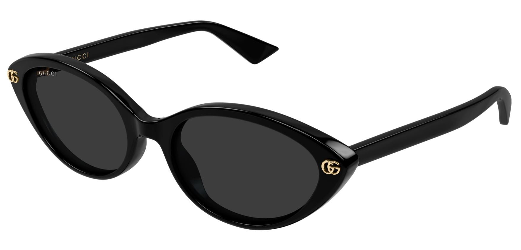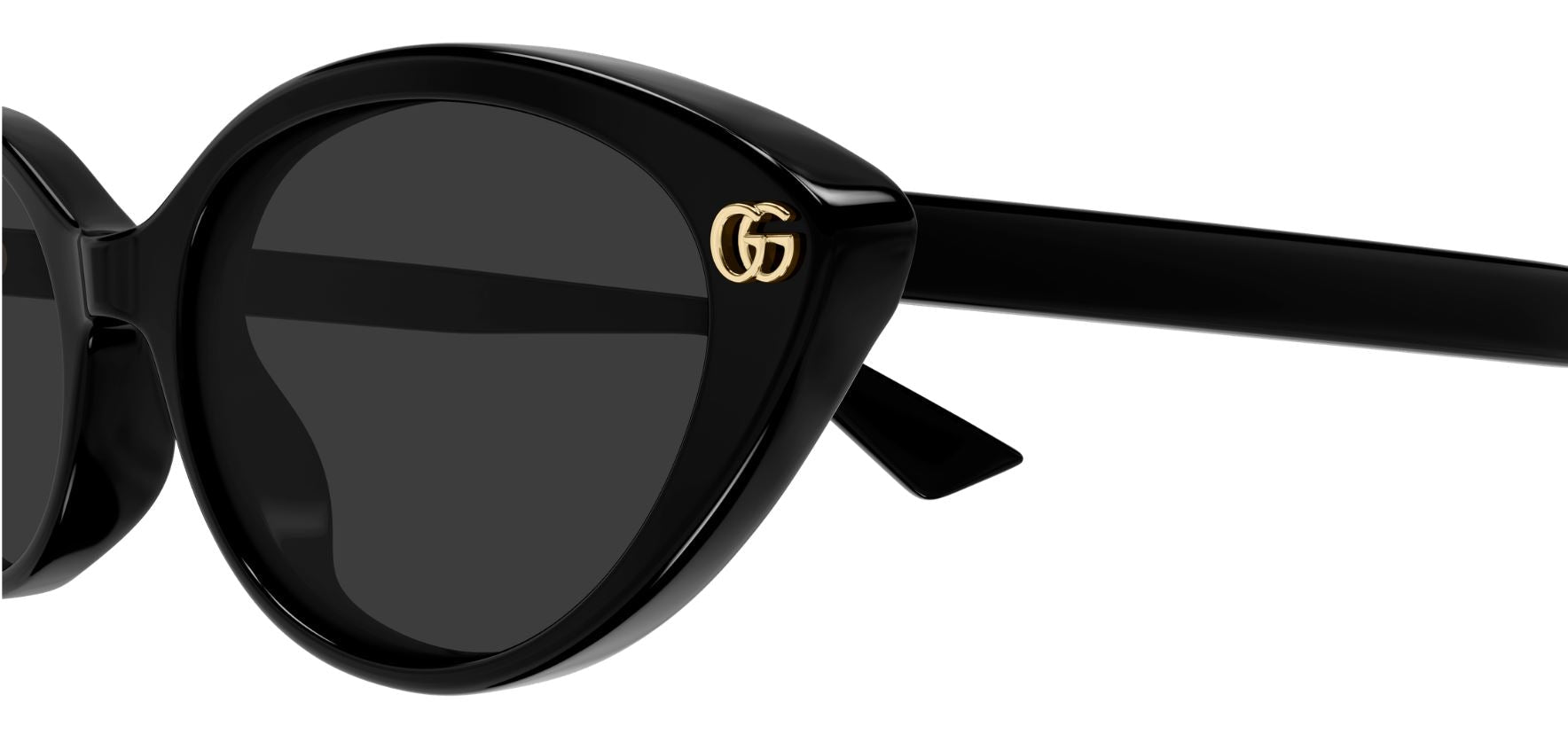 La montatura è realizzata in acetato nero lucido, con linee morbide ma strutturate che trasmettono eleganza e qualità premium. Il design è arricchito dal logo GG dorato sulle aste, dettaglio iconico che firma il modello con discrezione.