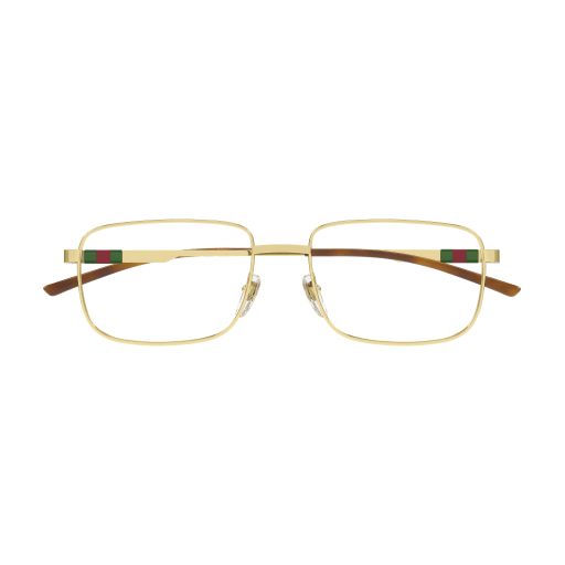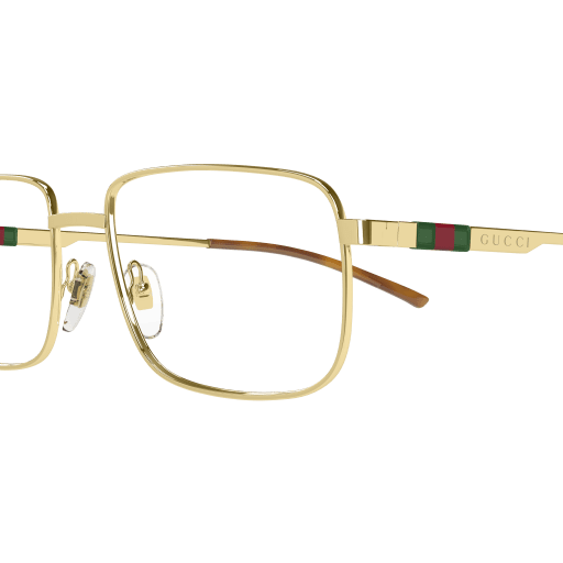 La forma rettangolare oversize dona equilibrio e carattere al viso, mentre le aste sottili sono impreziosite dal dettaglio a bande verde e rossa con logo Gucci inciso, simbolo di lusso e autenticità. I naselli regolabili e la leggerezza del metallo assicurano una vestibilità confortevole e stabile per tutto il giorno.