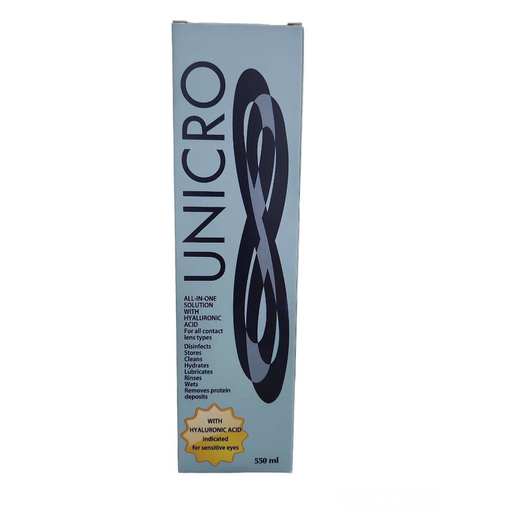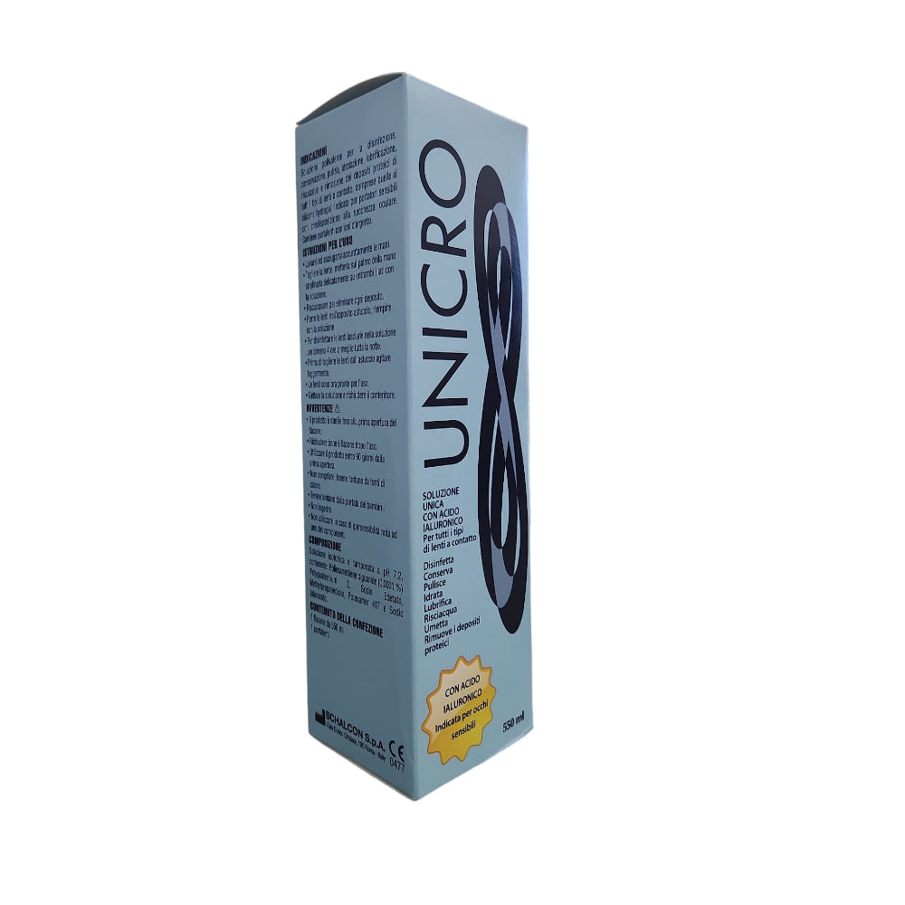 Scopri Unicro Soluzione Unica con Acido Ialuronico 550 ml, la soluzione completa per la cura quotidiana delle lenti a contatto, disponibile su Vision Ottica Infinity. Grazie alla sua formula innovativa con acido ialuronico, garantisce una pulizia profonda, una disinfezione efficace e un’idratazione prolungata, assicurando il massimo comfort visivo per tutta la giornata.