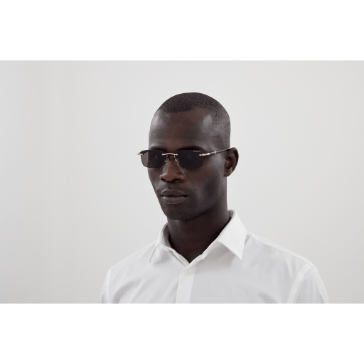 La montatura rimless con aste nere e dettagli dorati conferisce un aspetto leggero, sofisticato e moderno, ideale per chi desidera un look esclusivo e discreto. Le lenti grigie offrono protezione UV al 100%, garantendo una visione nitida e confortevole in ogni condizione di luce, mentre i naselli regolabili assicurano una vestibilità perfetta e un comfort duraturo.
