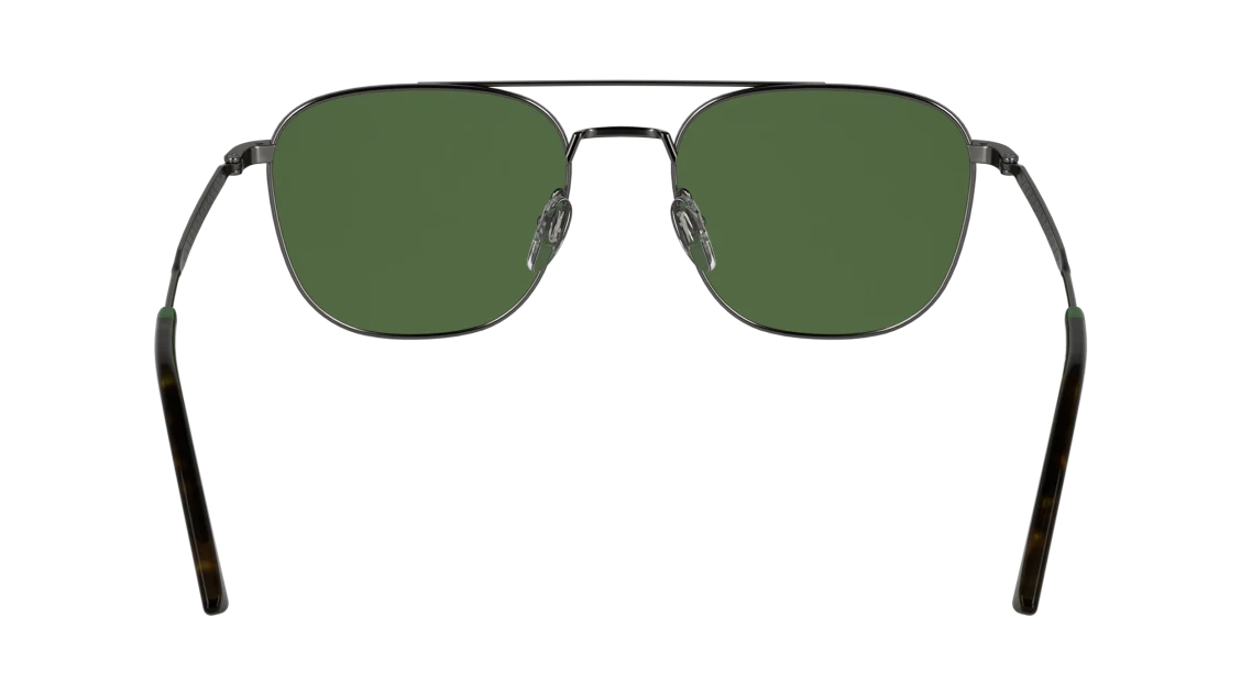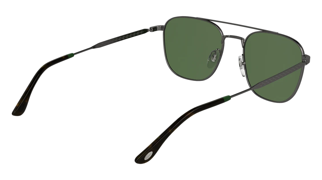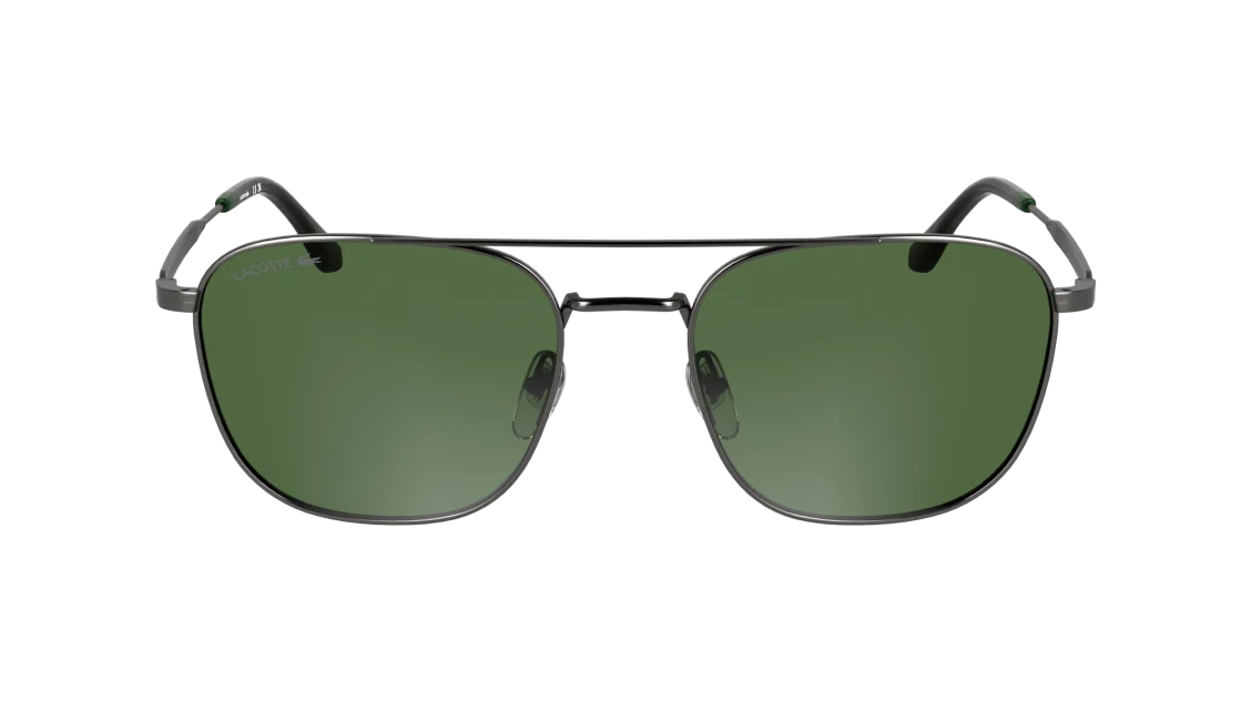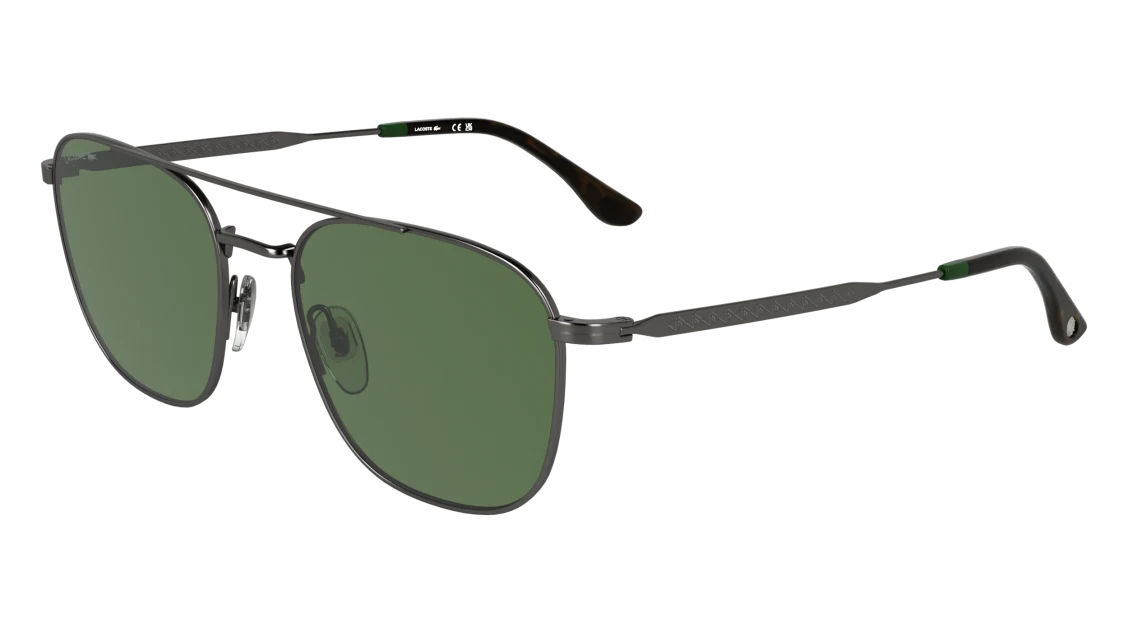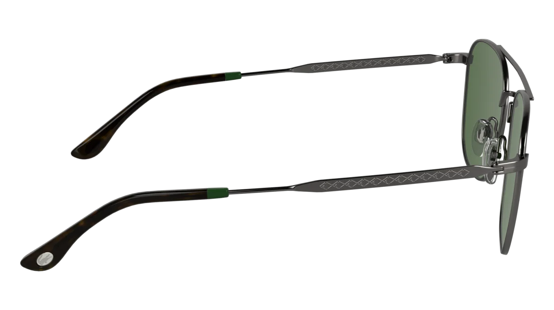 La montatura in metallo color canna di fucile (gunmetal) si distingue per la sua forma aviator moderna, leggera e resistente. Le aste sottili con dettagli verdi e logo Lacoste richiamano l’inconfondibile stile del brand, simbolo di sportività e classe. I naselli regolabili assicurano una vestibilità confortevole e stabile, mentre le lenti verdi offrono protezione UV al 100%, garantendo una visione nitida e un comfort visivo ottimale anche nelle giornate più luminose.