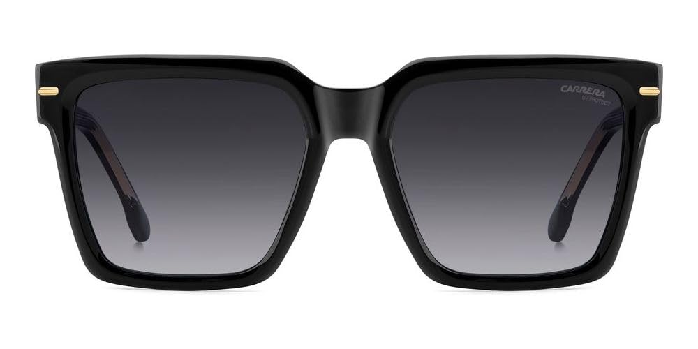 La montatura in acetato nero lucido si distingue per la sua forma squadrata oversize, arricchita da inserzioni dorate e dal logo Carrera sulle aste, simbolo di autenticità e stile iconico. Le lenti grigie sfumate offrono protezione UV al 100%, garantendo una visione nitida e confortevole in ogni condizione di luce, con un effetto elegante e sofisticato.