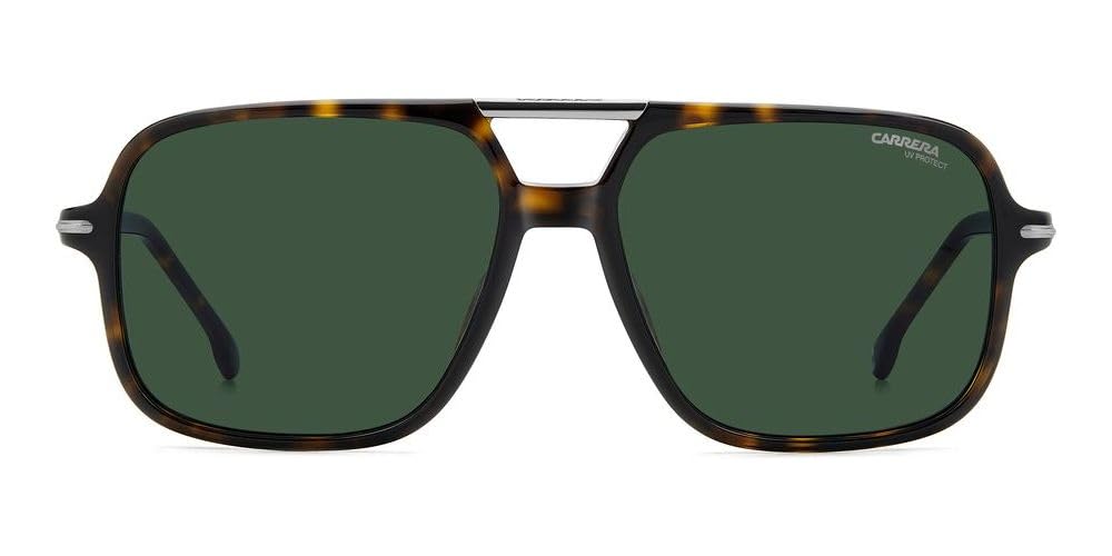 La montatura in acetato effetto havana si distingue per la sua forma squadrata e audace, arricchita dal ponte doppio in metallo che dona un tocco di carattere e raffinatezza. Le lenti verdi offrono protezione UV al 100%, assicurando una visione nitida e confortevole anche nelle giornate più luminose. Il logo Carrera inciso sulle aste sottolinea l’autenticità e lo stile distintivo del marchio.