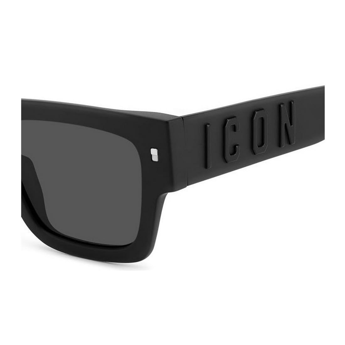 La montatura in acetato nero opaco si caratterizza per la sua forma squadrata oversize, che dona un aspetto deciso e maschile. Le aste spesse con la scritta “ICON” in rilievo tono su tono sono il segno distintivo del brand, simbolo di originalità e carattere. Le lenti grigio scuro offrono protezione UV al 100%, garantendo una visione nitida e comfort visivo anche nelle giornate più luminose.