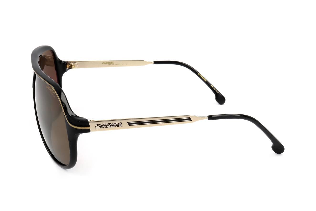 La montatura in acetato nero lucido con dettagli dorati e aste in metallo conferisce un aspetto sofisticato e dinamico, mentre le lenti marroni offrono protezione UV al 100%, garantendo una visione nitida e confortevole in ogni condizione di luce. Il logo Carrera inciso sulle aste sottolinea l’autenticità e lo stile distintivo del marchio.