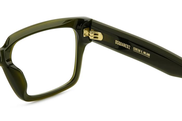Realizzata in acetato di alta qualità, la montatura presenta una finitura verde opaco che dona un tocco originale e raffinato. La forma squadrata valorizza i lineamenti del viso, offrendo un aspetto deciso e contemporaneo. Le aste spesse con logo Dsquared2 dorato aggiungono un dettaglio di lusso e riconoscibilità, mentre la struttura solida garantisce comfort e resistenza per un utilizzo quotidiano.