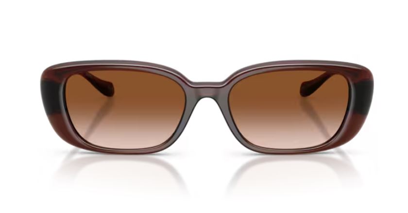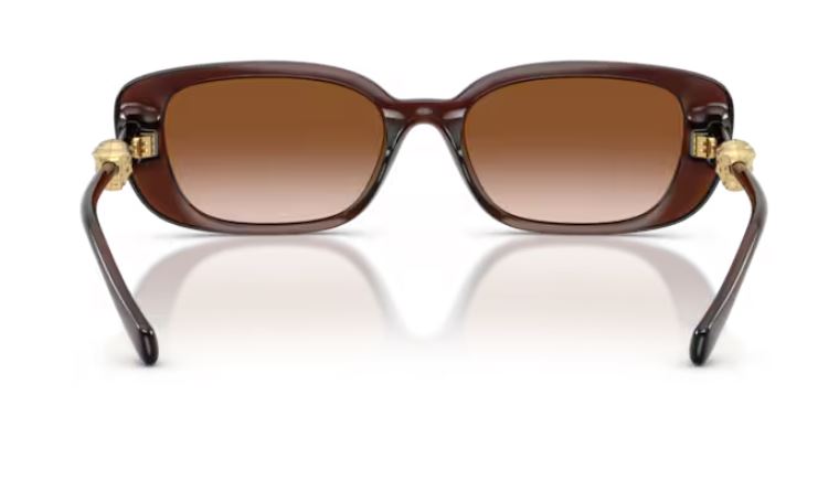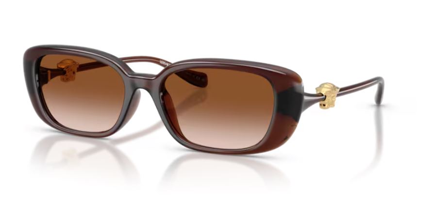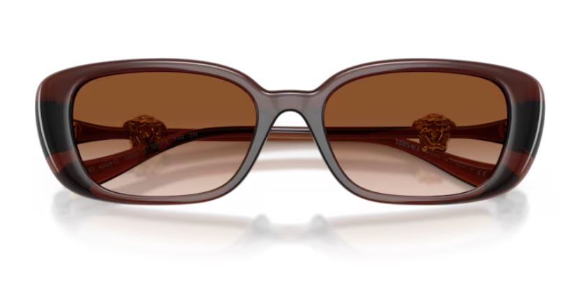 La montatura marrone trasparente, come visibile in foto, dona luminosità e leggerezza al volto, valorizzando l’incarnato con tonalità calde e avvolgenti. La forma ampia e morbida esalta lo stile femminile, mentre le aste sottili in metallo sono impreziosite dall’iconico dettaglio Medusa dorato, simbolo distintivo Versace.